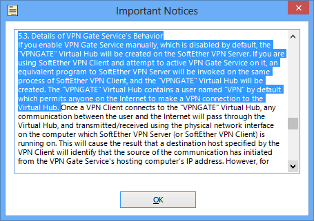 You must read the notices on the screen. Check the "Enable the VPN Gate Relay Service and join the VPN Gate Research as a Volunteer." check-box and click the "OK" button only if you understand and agree the notice.